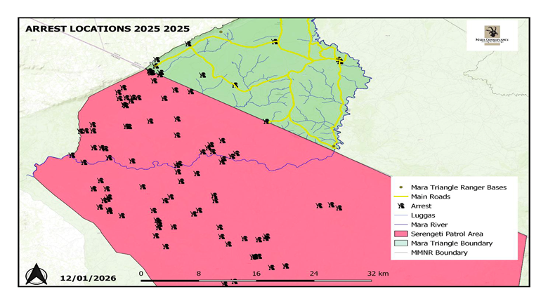 We managed to arrest 270 poachers in 2025 and recover 1,600 wire snares. The map below provides a good representation of the area covered by our patrol teams and the extent of poaching in the Northern Serengeti and Mara.