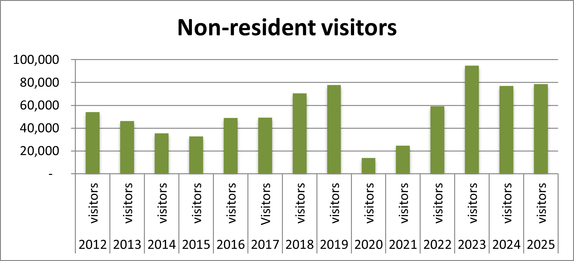 We had a total of 138,539 visitors to the Triangle, of which 78,523 were non-residents. This is slightly higher than 2024 (129,410 and 76,905 respectively) but well below 2023 .