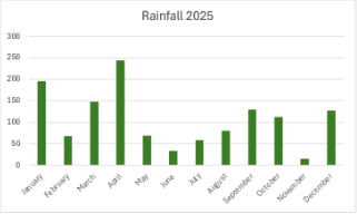 We had 1,280.11 mm (51.2”) of rain in 2025, continuing the above average rainfall we have been experiencing for the past few years. This above average rainfall has had a major impact on the vegetation – not all for the good. Unpalatable grasses and invasives have proliferated; hundreds of trees have died from waterlogging and the predominant grass – Themeda (red oat grass) has been replaced by grasses more suitable to the high rainfall. However, it looks like there has been a significant change in the weather, November was exceptionally dry and January has been relatively dry as well (65 mm against 190 mm last year) – are we in for a major drought? The Mara River is already approaching record lows.