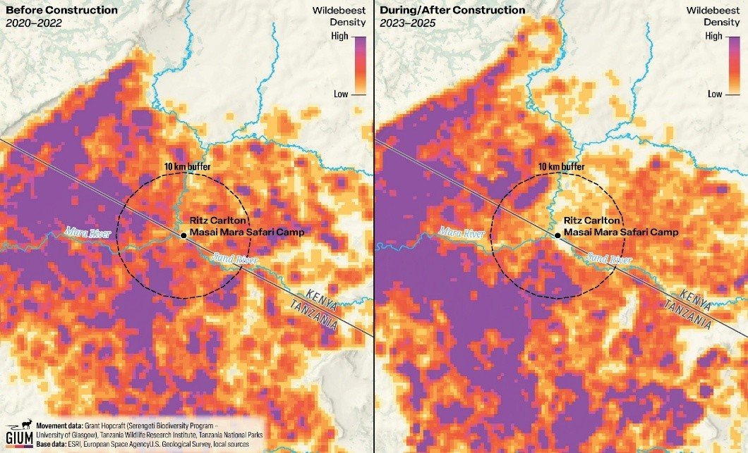 Wildebeest avoid buildings for up to six kilometers, 79% of the Serengeti/Mara is within six kilometers of a building/camp/lodge.