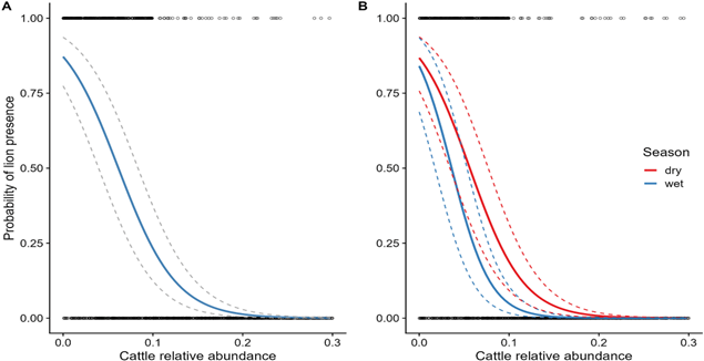 Both papers amply illustrate the negative effect of both tourist facilities and cattle concentrations on lion distribution. The figure below illustrates the effect of cattle on lion distribution (Mogensen et al, 2025).