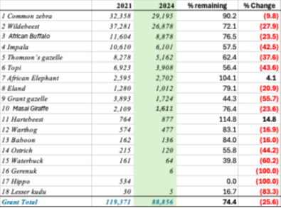 The Table above illustrates the continuing decline in the Mara ecosystem between 2021 & 2024. (Source: Kenya Wildlife Service: National Wildlife Census 2025). Overall, a 25.6% decline in three years from an area that generates tens of millions of US$ each year from wildlife.